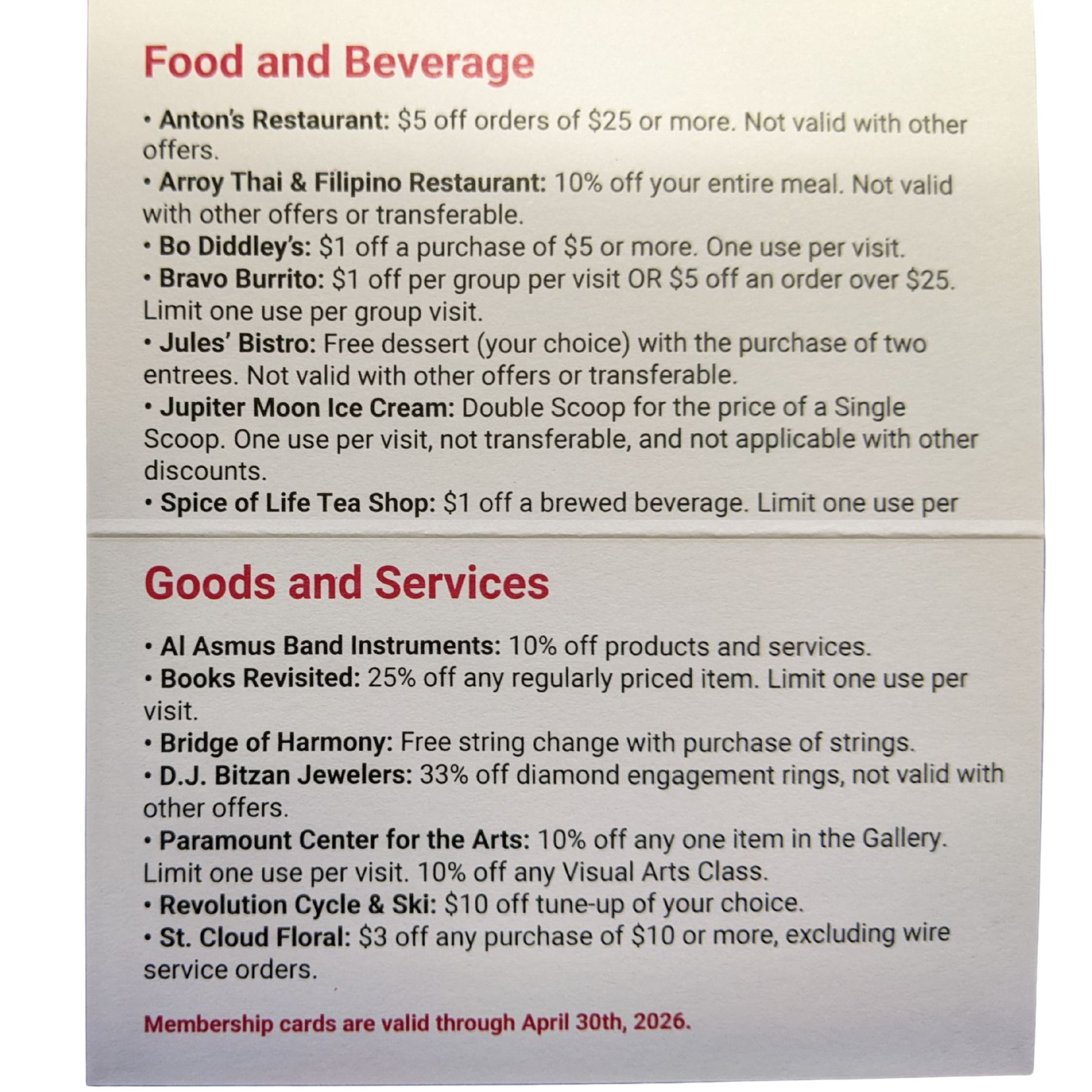 All purchases made through the KVSC store get you the KVSC Membership Card that provides discounts at several St. Cloud and area businesses through April 30, 2026.