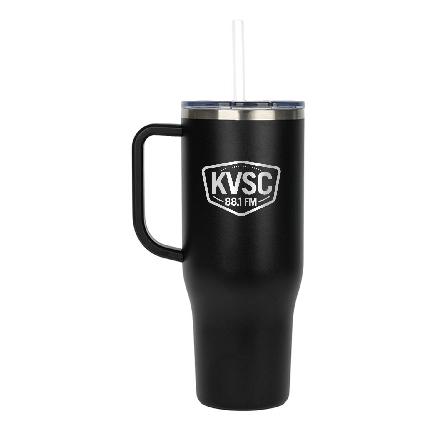 Keep your drinks at the perfect temperature while supporting KVSC with the Perka® Kempton 40 oz. Travel Mug! Designed for long-lasting adventures, this double-wall insulated mug keeps drinks hot for up to 18 hours and cold for 36. Its ergonomic handle, spill-resistant lid, and durable powder-coated finish make it ideal for road trips, outdoor escapes, and trivia marathons. Show your love for KVSC with every sip—every purchase directly fuels independent radio!